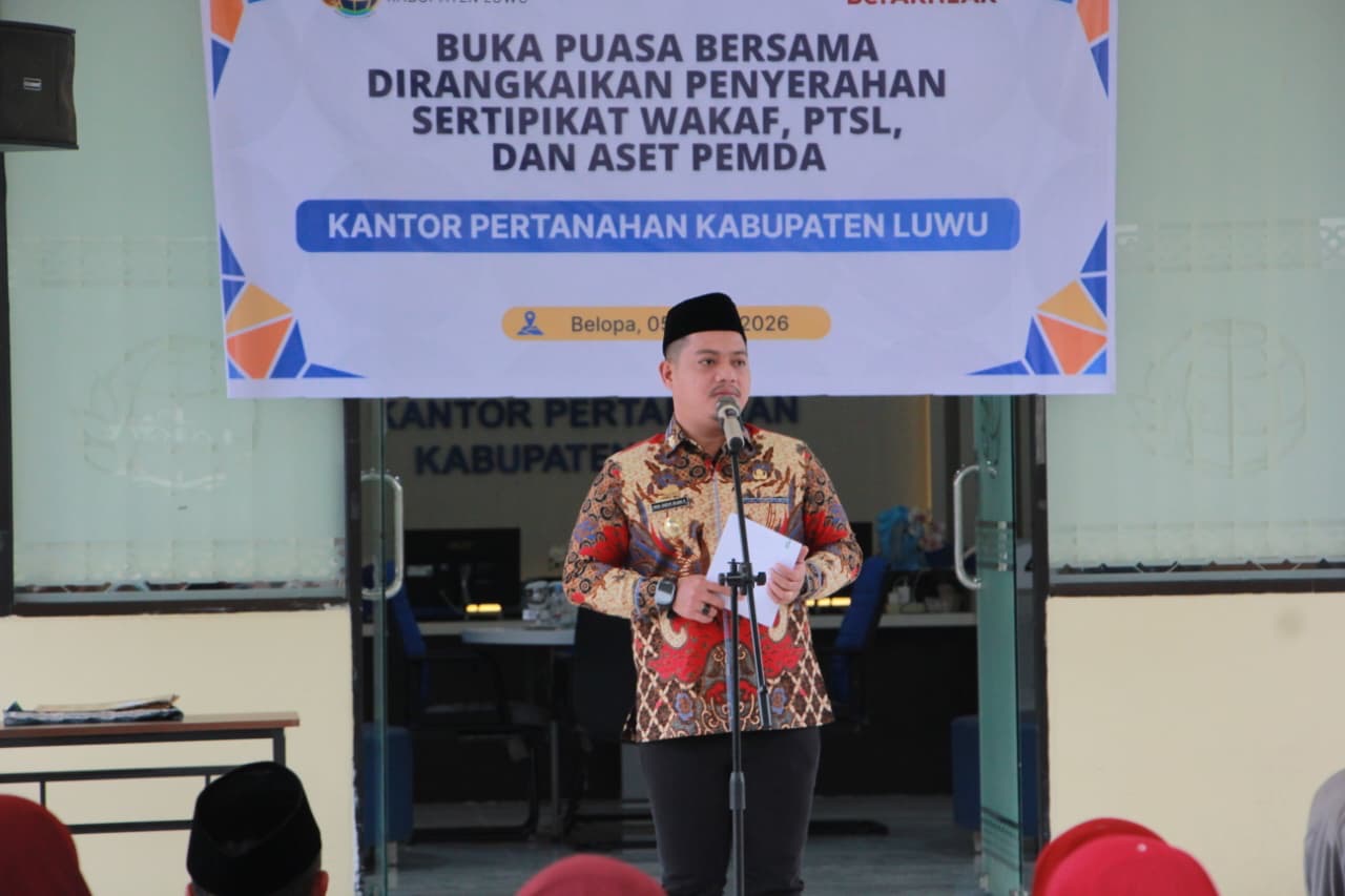 LUWU, HNMIndonesia.com – Wakil Bupati Luwu, Muh. Dhevy Bijak Pawindu, menghadiri kegiatan buka puasa bersama yang dirangkaikan dengan penyerahan sertipikat wakaf, program Pendaftaran Tanah Sistematis Lengkap (PTSL), serta sertipikat aset Pemerintah Daerah di Kantor Pertanahan Kabupaten Luwu, Kamis (5/3/2026).