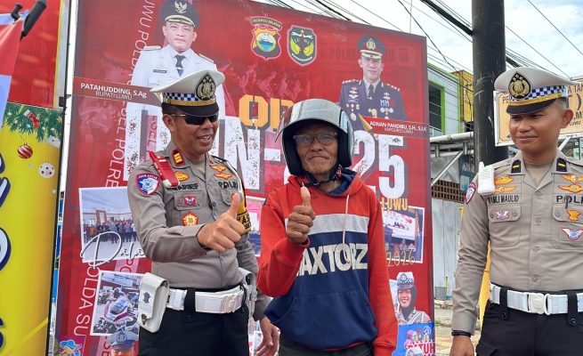 Humanis, Satlantas Polres Luwu Bagikan Helm kepada Pengendara di Operasi Lilin 2025